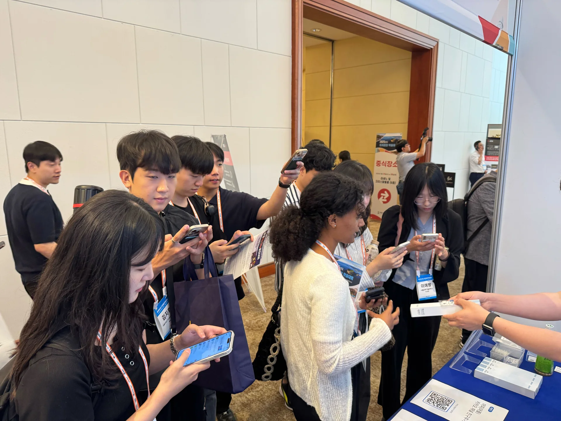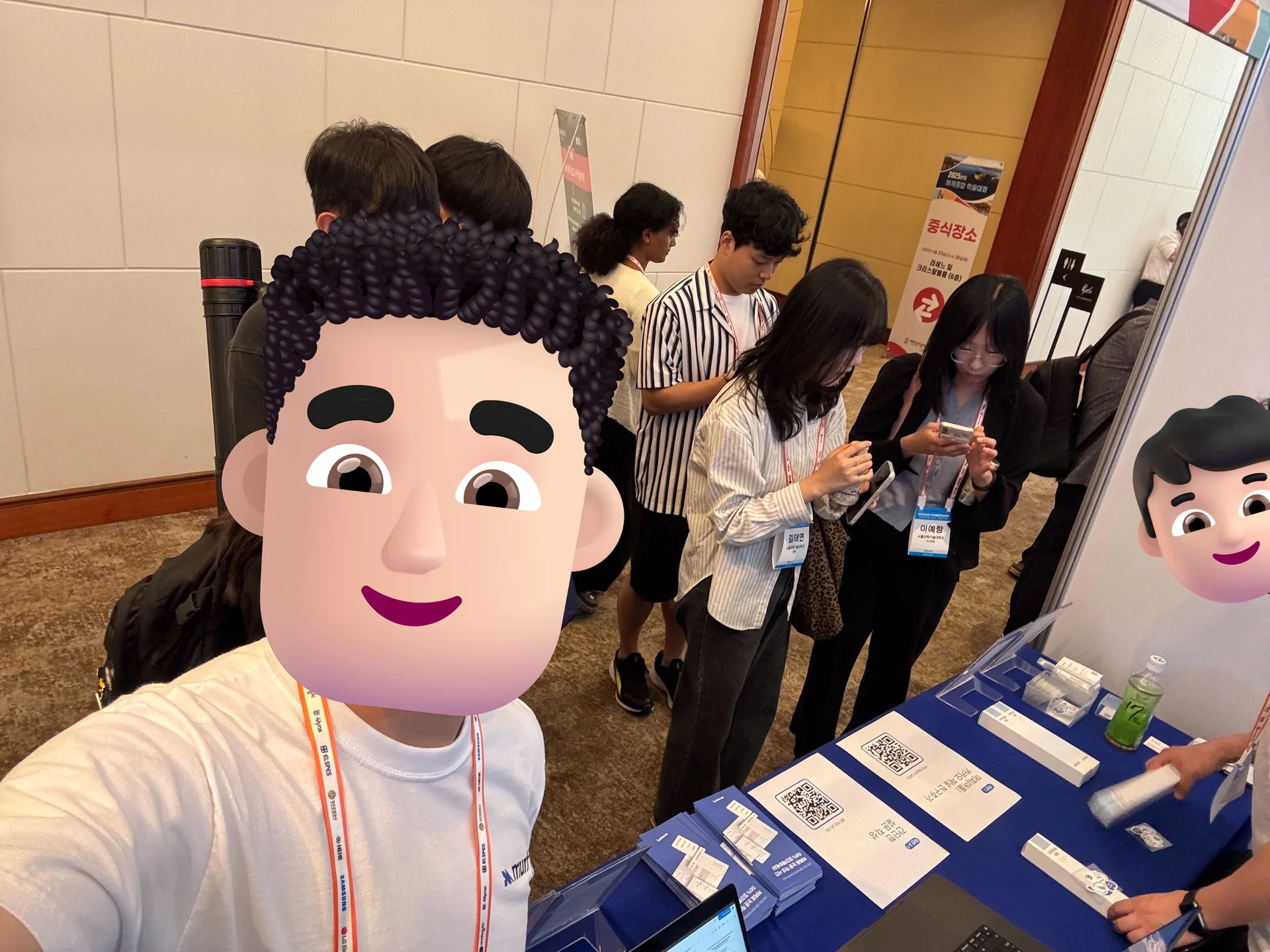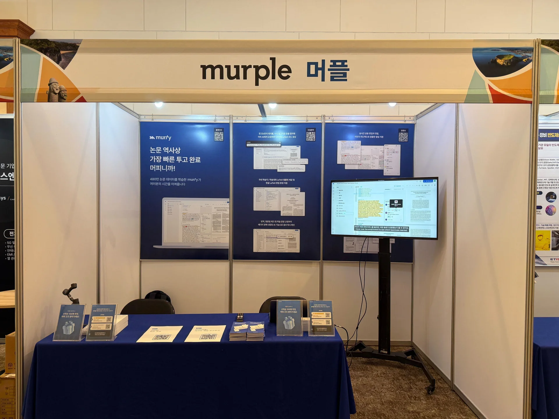 학술대회 기간 내내 Murfy부스에는 정말 '어마어마한 인파'가 몰려와 성황을 이루었습니다. 예상했던 것보다 훨씬 더 많은 분들이 Murfy의 AI 기반 LaTeX 에디터와 협업 기능에 깊은 관심을 보여주셨고, 한때는 부스 공간에 '병목 현상'까지 발생할 정도로 문전성시를 이루었습니다.