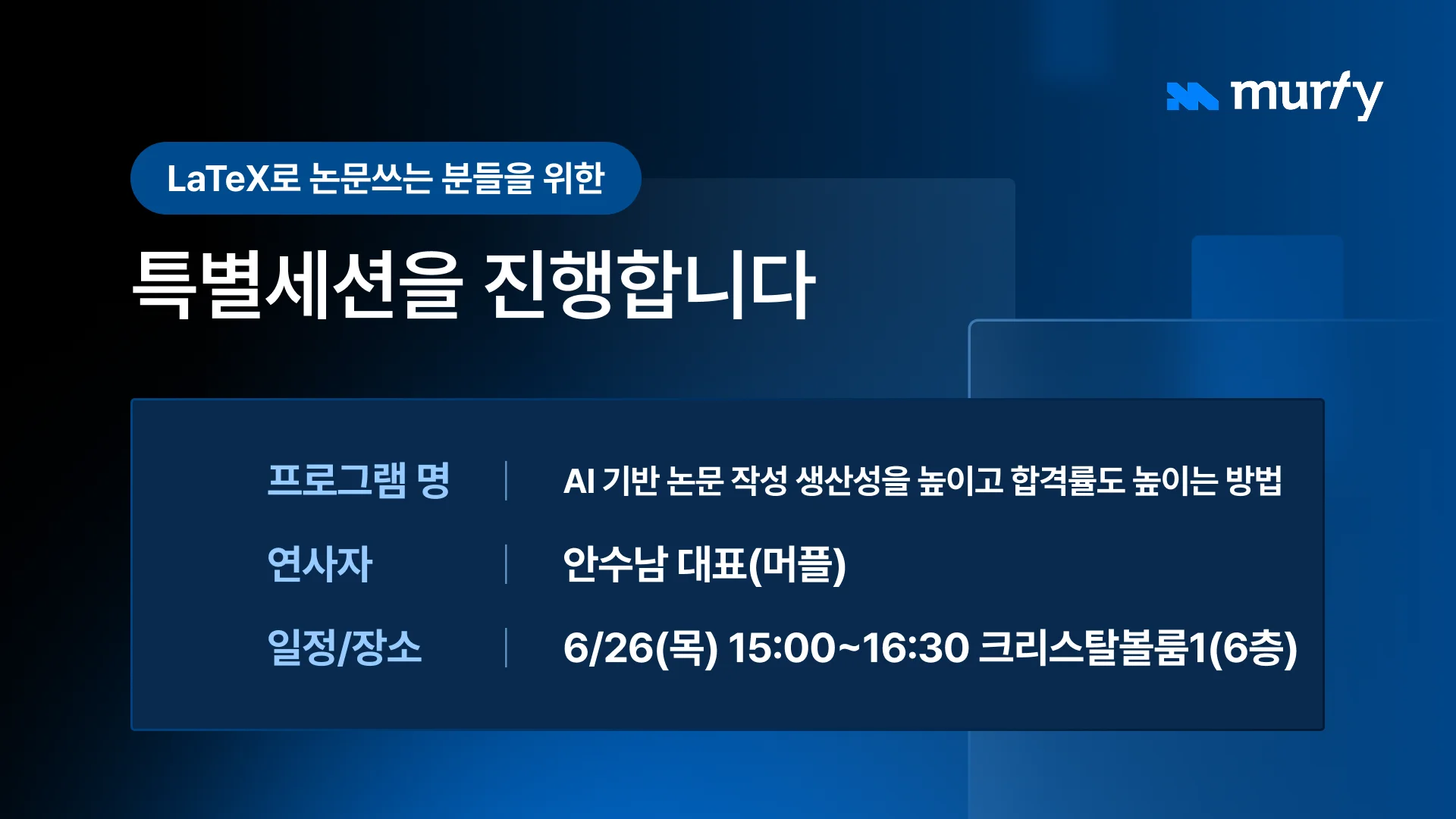 이번 학술대회에서 Murfy는 튜토리얼 발표를 통해 "AI 시대의 LaTeX 논문 작성 전략"을 주제로 강연을 진행했습니다. 참가자들은 Murfy의 AI 기능이 어떻게 연구자들의 글쓰기 과정을 돕고, 협업 효율을 극대화하며, 궁극적으로 논문 작성 시간을 획기적으로 단축시킬 수 있는지에 대해 깊이 있는 설명을 들을 수 있었습니다. 질의응답 시간에는 열정적인 질문들이 쏟아지며 Murfy가 제시하는 새로운 패러다임에 대한 높은 관심을 증명했습니다.