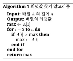 algorithm 환경은 알고리즘 블록을 하나의 독립된 객체로 취급하고, 제목(caption)과 레이블(label)을 붙일 수 있어서 논문이나 보고서를 작성할 때 ‘알고리즘 1 참조’와 같이 간편한 인용이 가능하도록 도와줍니다.