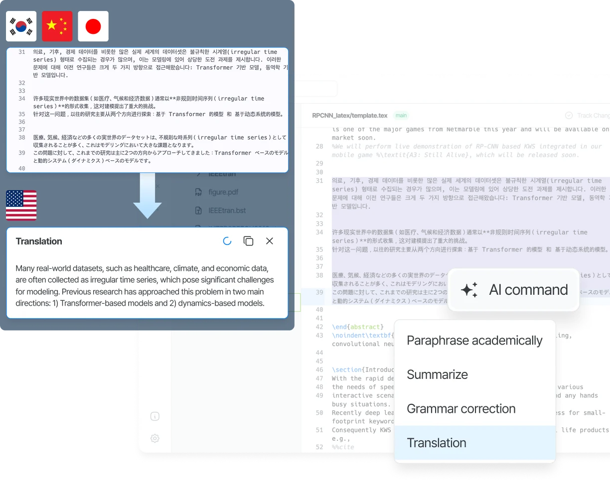 강력한 기능은 그대로: 한글 LaTeX 작성 환경에서도 Murfy의 초고속 컴파일, AI 기반 문법 교정, 실시간 협업 및 버전 관리 등 모든 강력한 기능들을 그대로 활용할 수 있습니다.
