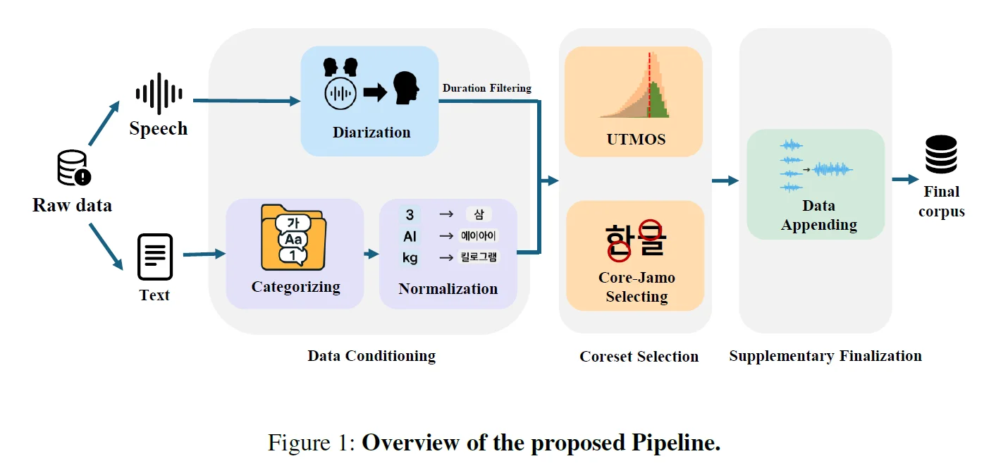 이번 논문에서는 저희가 새롭게 개발한 한국어 음성 합성용 전처리 프레임워크를 제안했습니다. 자음-모음 단위로 데이터를 균형 있게 구성하고, 텍스트 노멀라이제이션 과정을 거쳐 음성 합성 품질을 높이는 것이 핵심이에요. 특히 저자원 한국어 환경에서도 잘 작동하도록 설계한 점이 특징입니다.